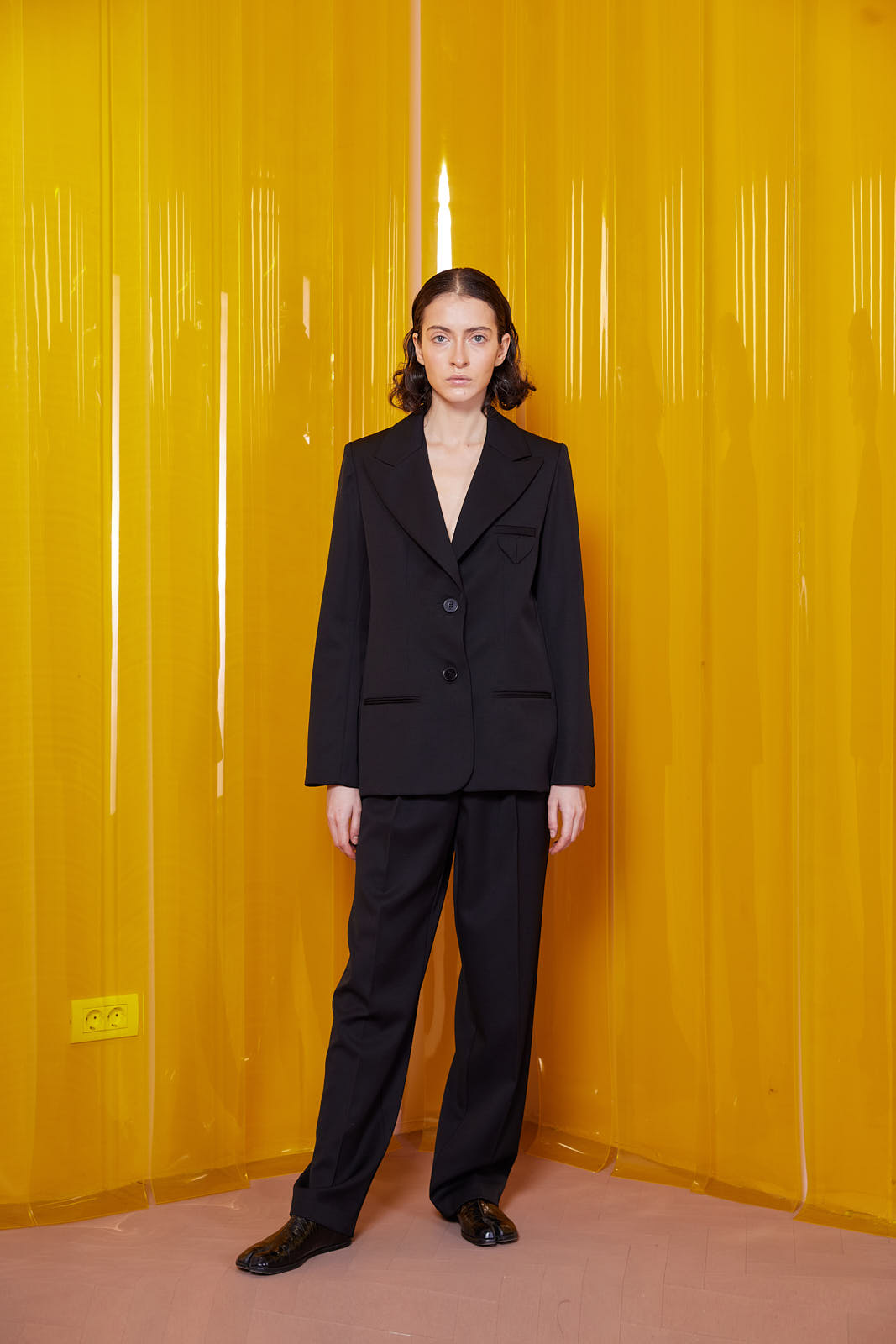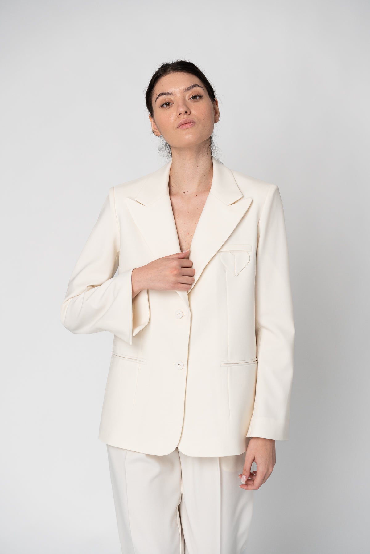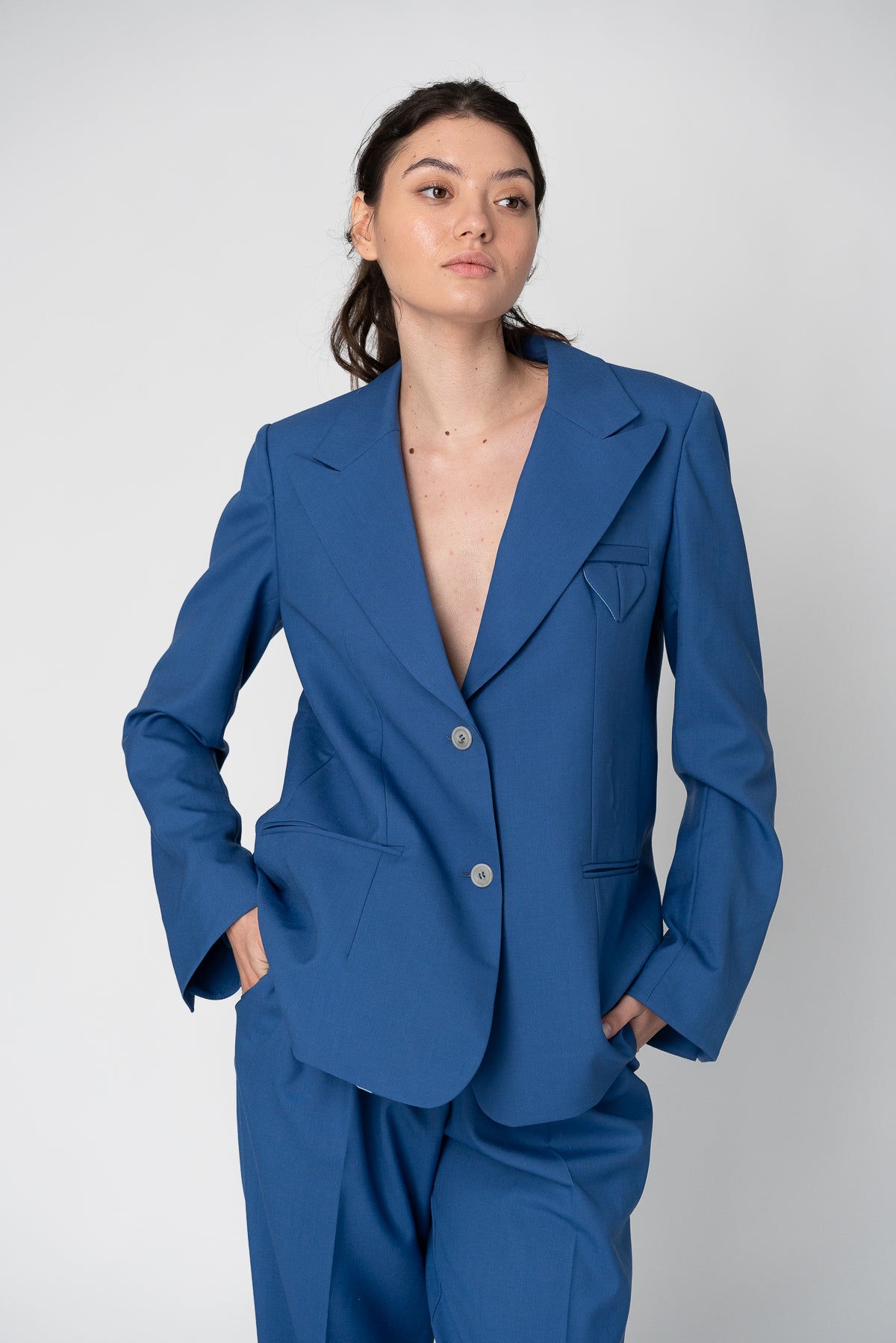 Blazer made of wool fabric, with a straight cut, two side pockets and the brand's specific logo on the chest. There are slits on the back of the blazer and sleeves. The closure is made with buttons.